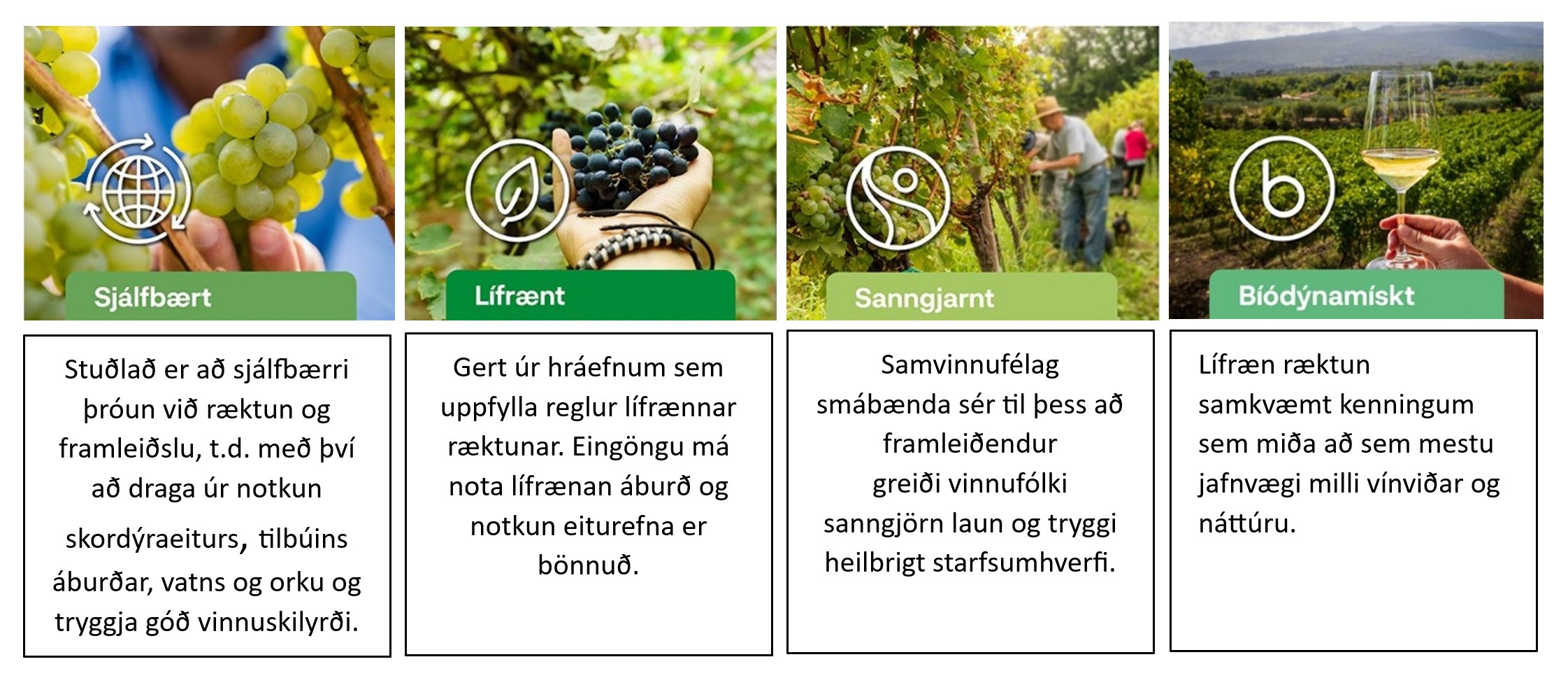 Vínbúðin leggur áherslu á að bjóða vörur sem framleiddar eru í sátt við samfélag og umhverfi. Til að auka gagnsæi fyrir neytendur eru sérstakar merkingar í hillum Vínbúðanna og hér á vefnum fyrir vottaðar vörur. Í þeim flokki eru vörur sem hafa vottun um lífræna ræktun, sjálfbæra framleiðslu, bíódínamíska ræktun og vottun um sanngjarna framleiðslu.