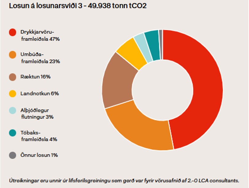 ÁTVR hefur reiknað kolefnisspor rekstrarins og er það 49.938 tonn CO2-ig. Langstærsti hlutinn er í aðfangakeðjunni, umfangi 3. eða rúm 99,6%.